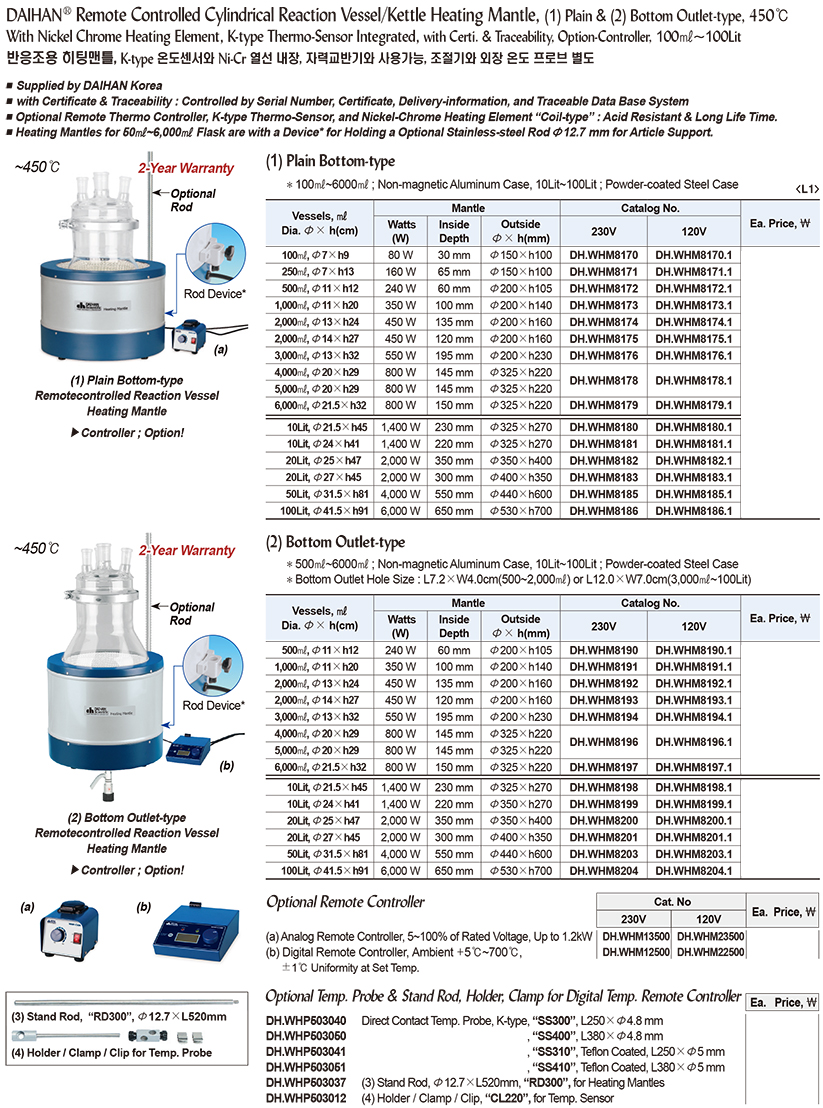 DAIHAN Aluminum-case Remotecontrolled Reaction Vessel Heating Mantle, (1) Plain Bottom & (2) Bottom Outlet-type, 450℃