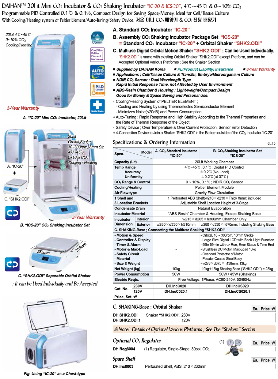 DAIHAN® 20Lit Mini CO2 Incubator & CO2 Shaking Incubator “IC-20 & ICS-20”, 4℃~45℃ & 0~10% CO2