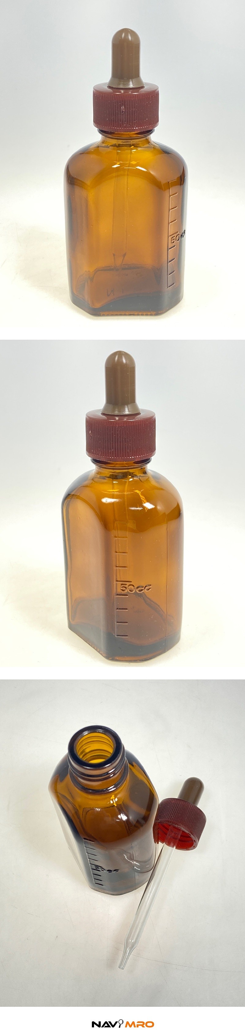 유리 재질의 병과 플라스틱 캡 그리고 유리 스포이드로 구성