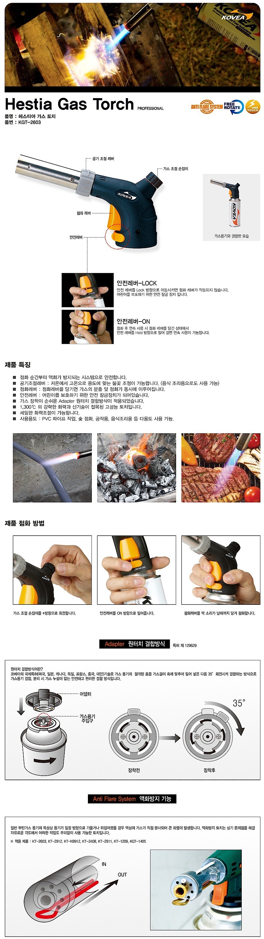 점화순간부터 액화방지 시스템(일반 부탄가스 용기의 특성상 용기가 일정 방향으로 기울거나 뒤집어 졌을 경우
