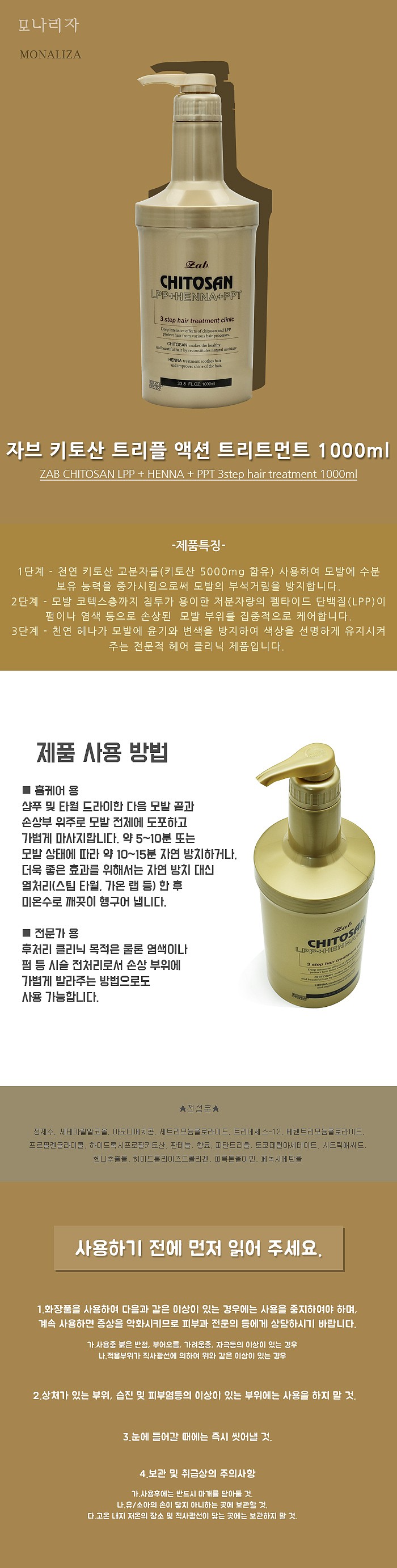 1단계 : 천연 키토산 고분자를 사용하여 모발에 수분 보유 능력을 증가시켜 모발의 부석거림을 없애줌