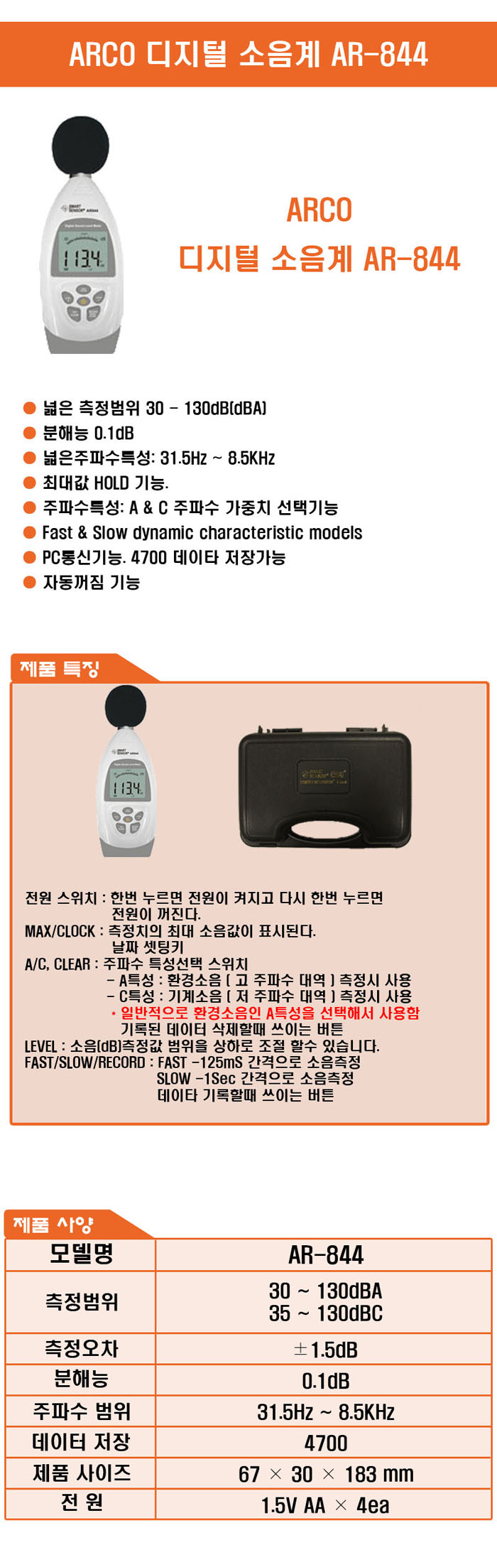 데이터 로거 소음계 AR-844