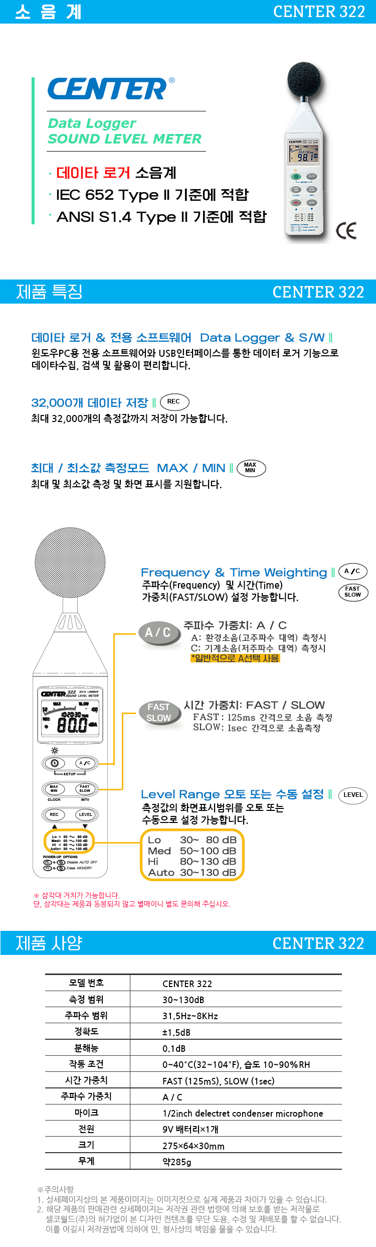 데이터 로거 소음계 CENTER322