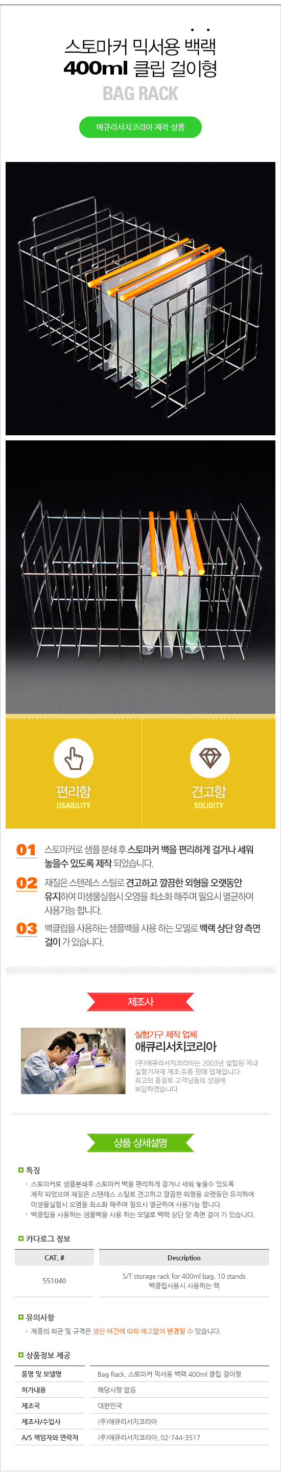 Bag Rack, 스토마커 믹서용(Stomacher Mixer) 백랙 - 400ml 클립 걸이형