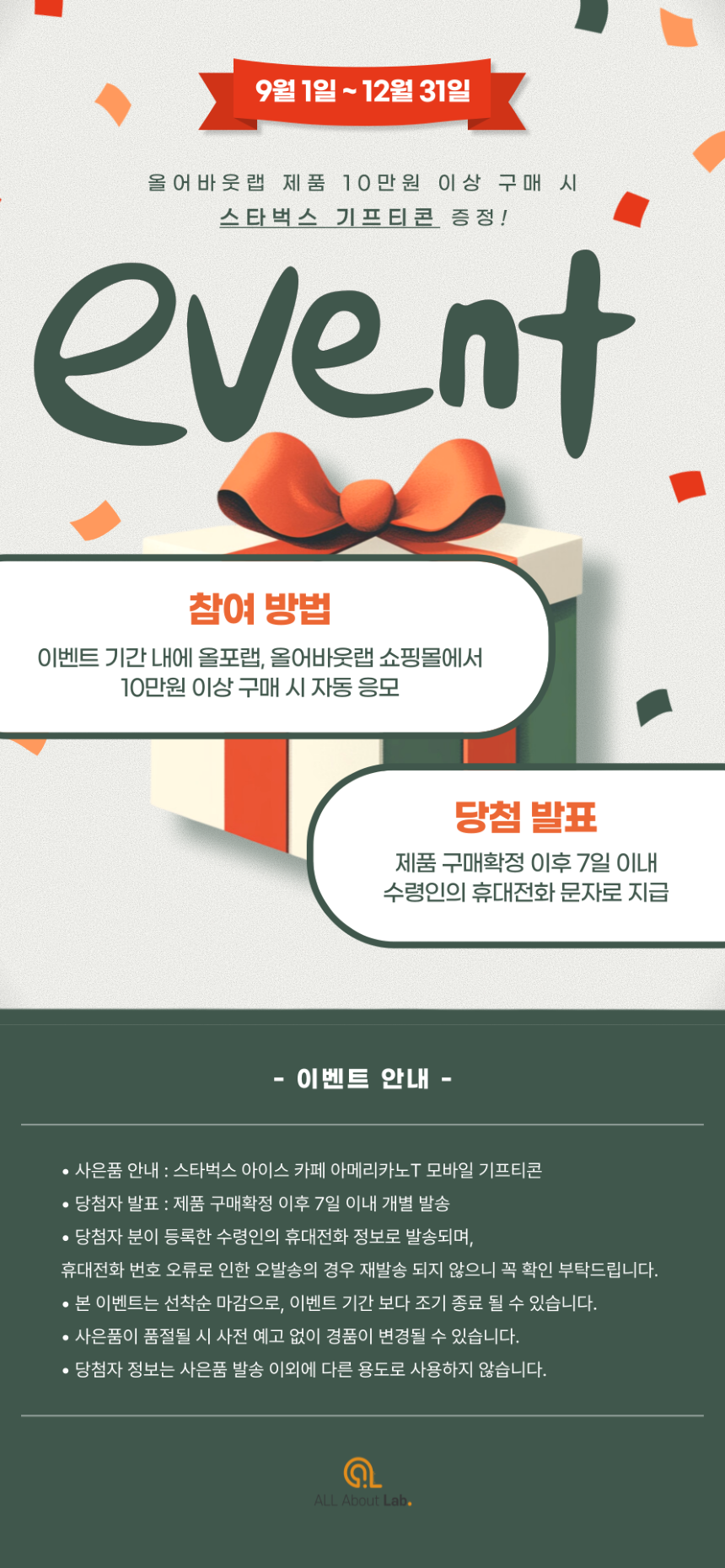 - 주문금액 50,000원 이상 : 운임비 올어바웃랩 부담 (단, 택배배송 불가능 상품은 고객부담)