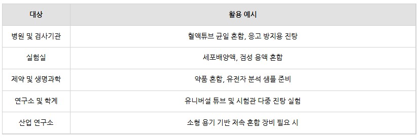 혈액 샘플, 점성 시료, 배양액 등 혼합이 어려운 시료를 부드럽게 균질화할 수 있어 생명과학, 병리학, 화학 실험 등 폭넓은 분야에 활용됩니다.