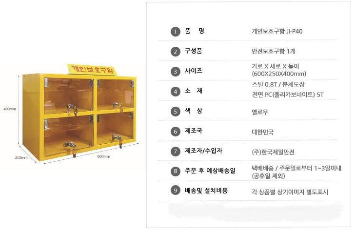 - 가로 600×세로 250×높이 400㎜ 규격으로 개인이 각각 사용할 수 있도록 기본 4칸으로 구성, 개별 장금 장치가 되어 있어 개인이 사용하기 편리하도록 하였습니다.