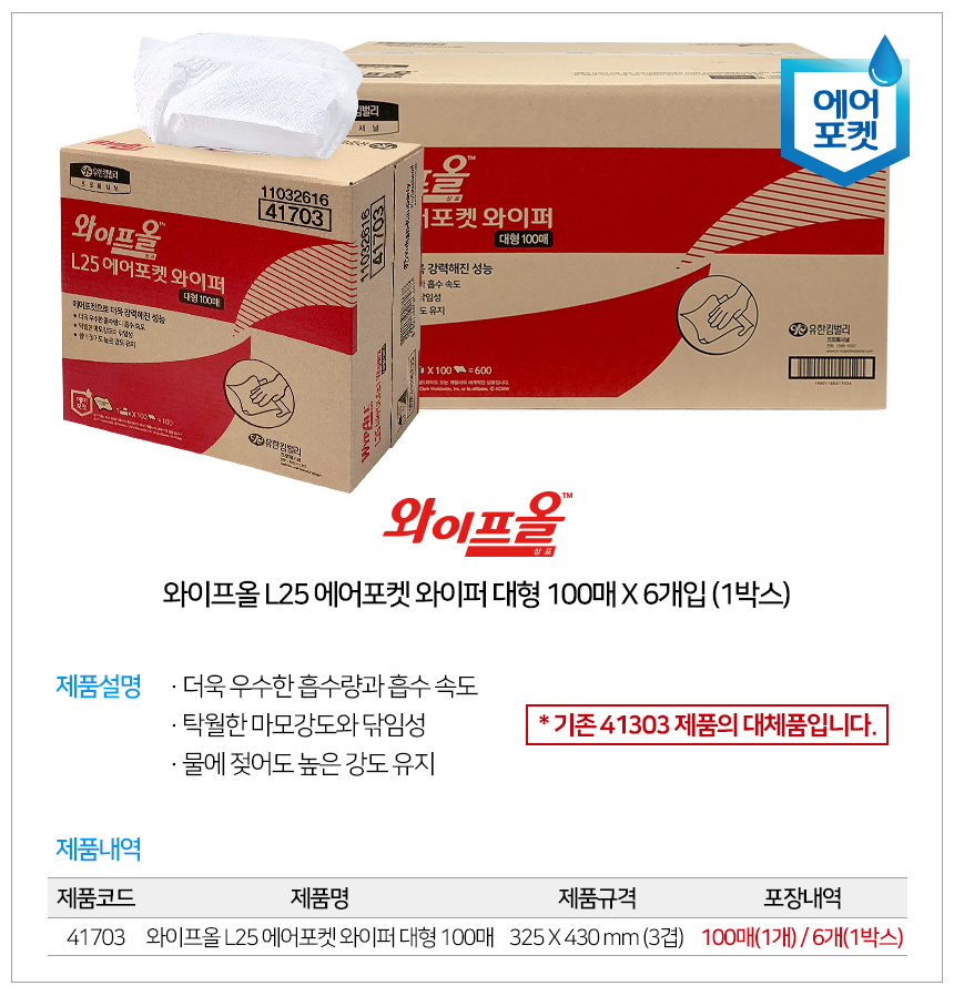 | 와이프올L25 41703 와이퍼 대형 100매X6카톤 | 41703 | 325X430mm 겹수 : 3겹 포장 내역 : 100매X6카톤 | 박스(6카톤) |