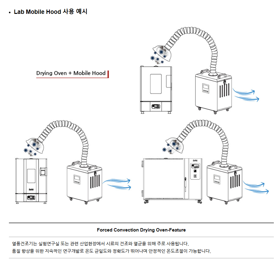 강제대류(Forced Convection) 방식의 열풍 순환 건조기로, 챔버 내부의 균일한 온도 분포를 구현합니다.