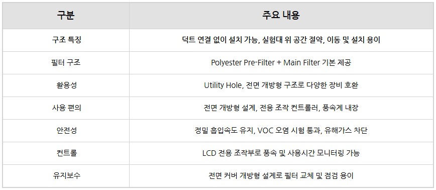 덕트 설치가 어려운 실험 환경에서 사용하기 적합한 무덕트 흄후드 DLH 시리즈는