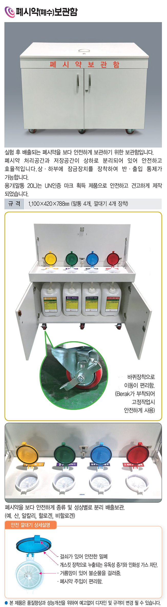 개요 : 실험 후 배출되는 폐시약을 보다 안전하게 보관하기 위한 보관함입니다. 폐시약 처리공간과 저장공간이 상하로 분리되어 있어 안전하고 효율적입니다. 상·하부에 잠금장치를 장착하여 반·출입 통제가 가능합니다. 용기(말통 20L)는 UN 인증 마크 획득 제품으로 안전하고 견고하게 제작되었습니다.