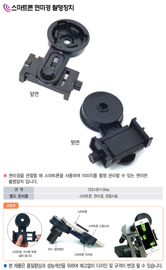 스마트폰 현미경 촬영장치는 현미경 관찰 장면을 스마트폰으로 간편하게 촬영할 수 있는 기능성 어댑터입니다.