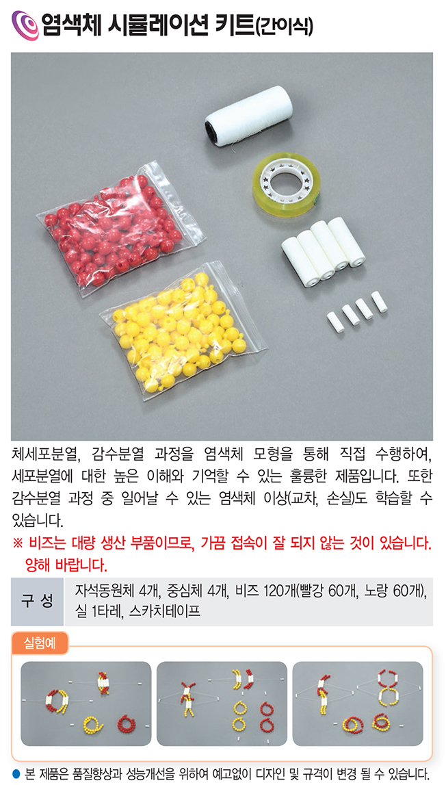 염색체 시뮬레이션 키트는 세포분열과 감수분열 과정을 염색체 모형으로 직접 구성하며 학습할 수 있는 교육용 교구입니다.