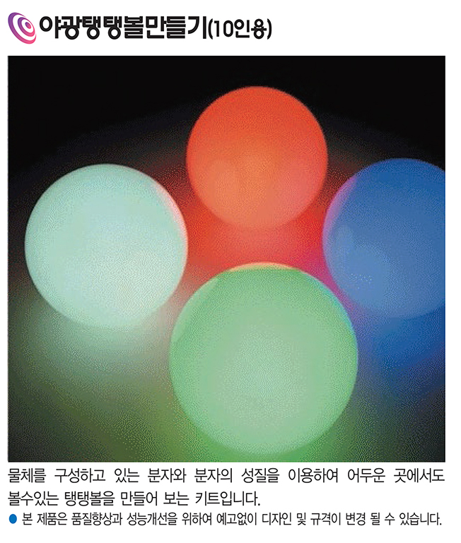 야광탱탱볼 만들기 키트는 어두운 곳에서도 빛나는 탱탱볼을 직접 제작해보는 과학 체험 세트입니다.