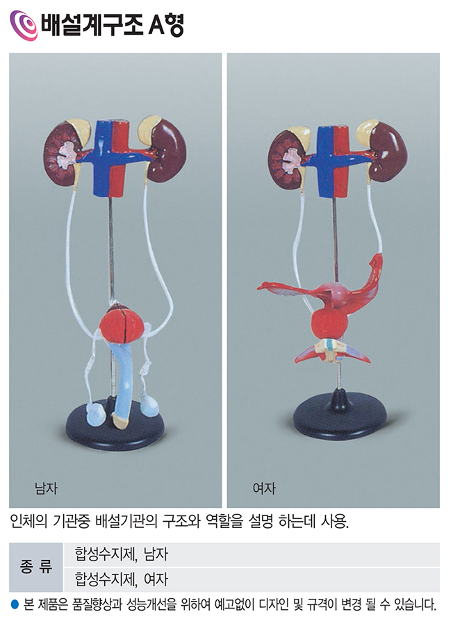 배설계구조 A형은 인체의 신장, 요관, 방광 등 배설기관의 구조와 기능을 쉽게 설명할 수 있도록 제작된 교육용 입체 모형입니다.