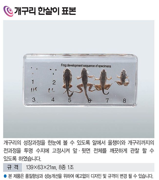 개구리의 알부터 올챙이, 다리가 자라는 단계, 성체 개구리까지의 발달 과정을 한눈에 볼 수 있도록 구성된 학습용 표본입니다.