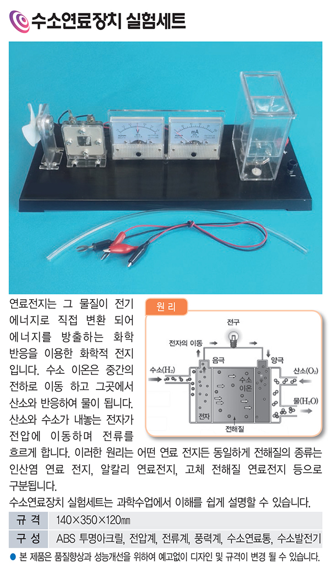 수소연료장치 실험세트는 수소와 산소의 화학 반응을 통해 전기에너지가 생성되는 연료전지의 원리를