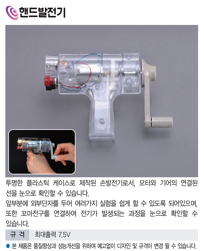손잡이를 돌리면 전기가 생성되는 원리를 쉽게 이해할 수 있으며, 외부 단자를 이용해 다양한 전기 실험도 가능합니다.
