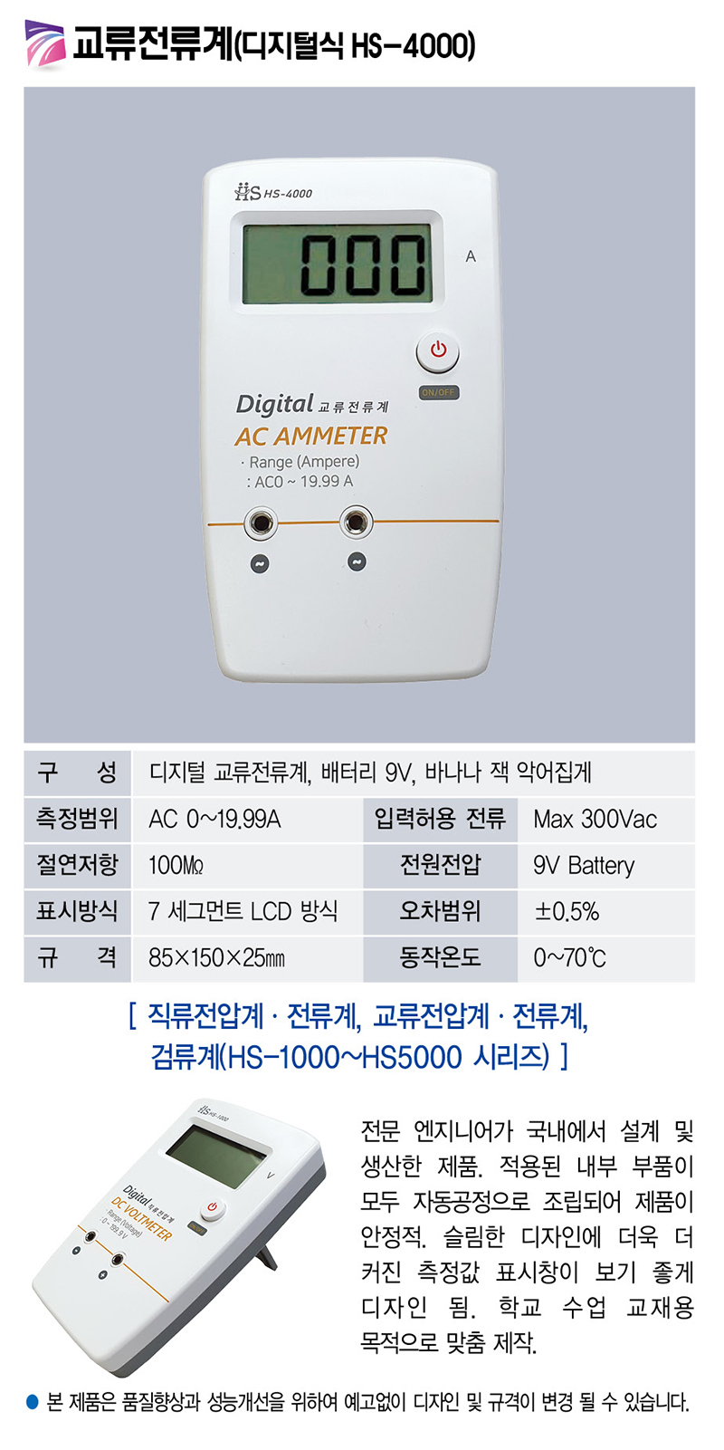 디지털 교류전류계는 AC 0~19.99A 범위를 정확하게 측정할 수 있는 교육용·실험용 전류 측정기입니다.