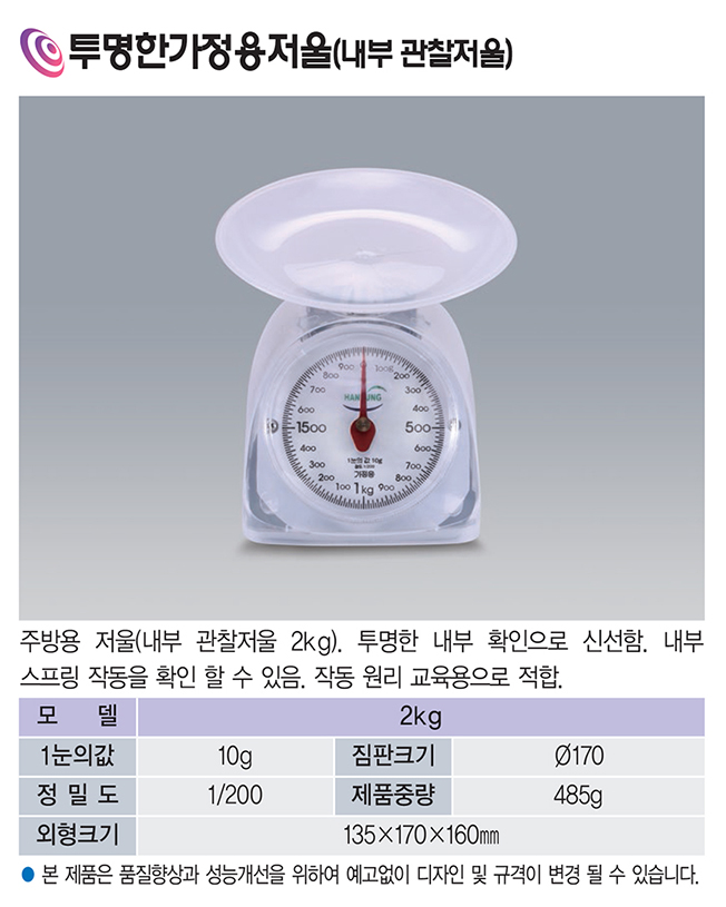 개요 : 주방용 저울(내부 관찰저울 2kg). 투명한 내부 확인으로 신선함. 내부 스프링 작동을 확인할 수 있음. 작동 원리 교육용으로 적합.