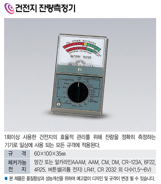 건전지 잔량측정기는 1회 이상 사용한 건전지의 효율적 관리를 위해 잔량을 정확히 측정하는 기기입니다.