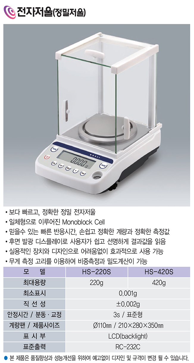 개요 : ▶보다 빠르고, 정확한 정밀 전자저울 ▶일체형으로 이루어진 Monoblock Cell ▶믿을 수 있는 빠른 반응시간, 손쉽고 정확한 계량과 정확한 측정값 ▶후면 발광 디스플레이로 사용자가 쉽고 선명하게 결과값을 읽음 ▶실용적인 장치와 디자인으로 어려움없이 효과적으로 사용 가능 ▶무게 측정 고리를 이용하여 비중측정과 밀도계산이 가능