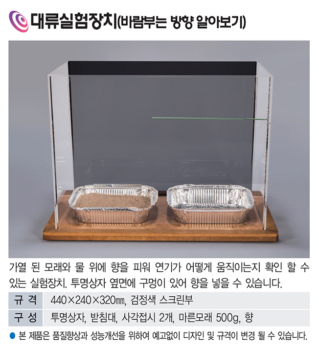 가열된 모래와 물 위에 피워진 향의 연기가 어떻게 움직이고 흘러가는지 직접 확인할 수 있는 대류실험장치입니다.