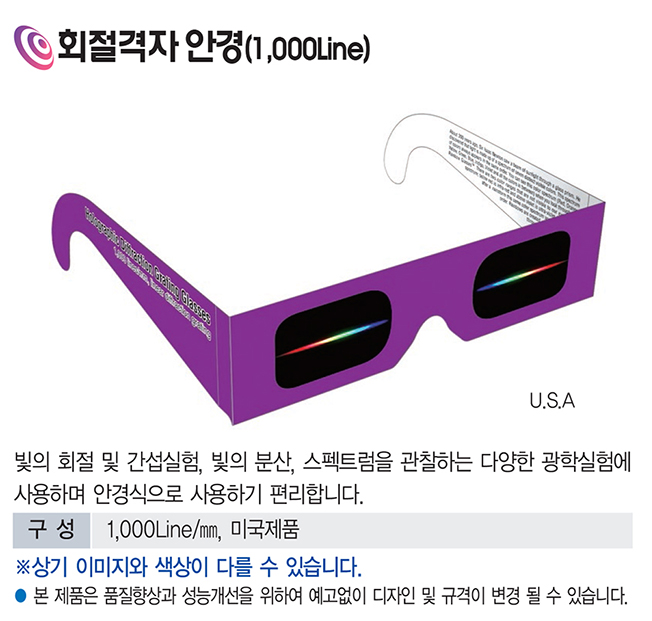 회절격자 안경(1,000Line)은 빛의 회절과 분산 현상을 선명하게 관찰할 수 있는 교육용 광학 실험도구입니다.