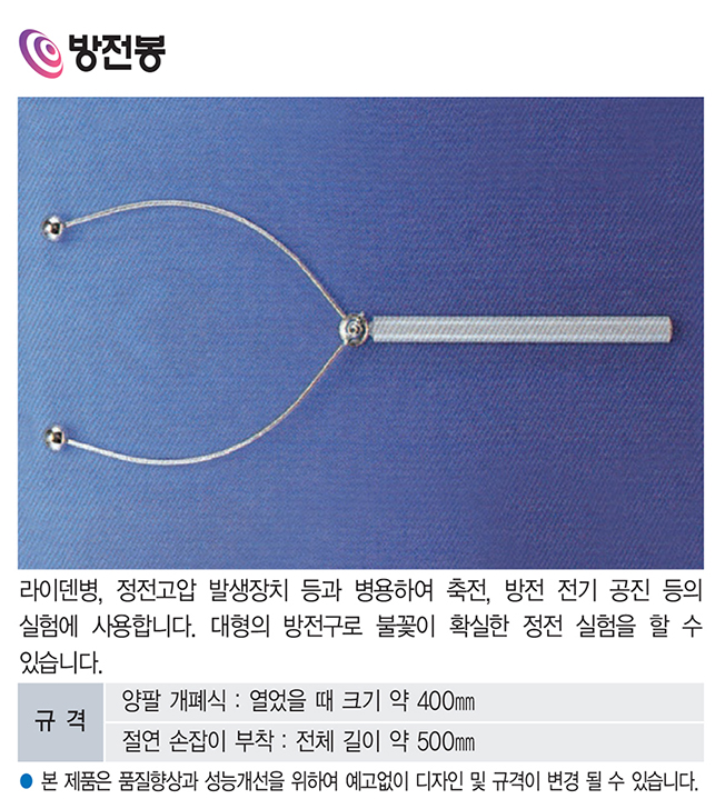 정전고압 발생장치나 라이덴병과 함께 사용하여 정전기 축적 및 방전 현상을 직접 관찰할 수 있는 대형 방전봉입니다.