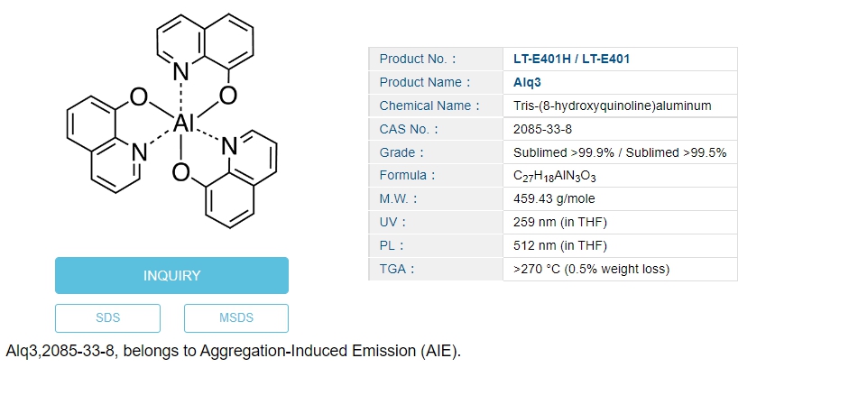 [LUMTEC] LT-E401H/Alq3/2085-33-8/Tris-(8-hydroxyquinoline)aluminum/Sublimed >99.8%