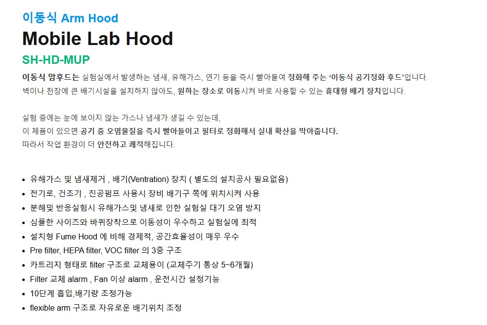SH-HD-MUP 이동식 Lab Hood는 유해가스와 냄새를 효과적으로 제거할 수 있는 휴대형 배기 시스템입니다.