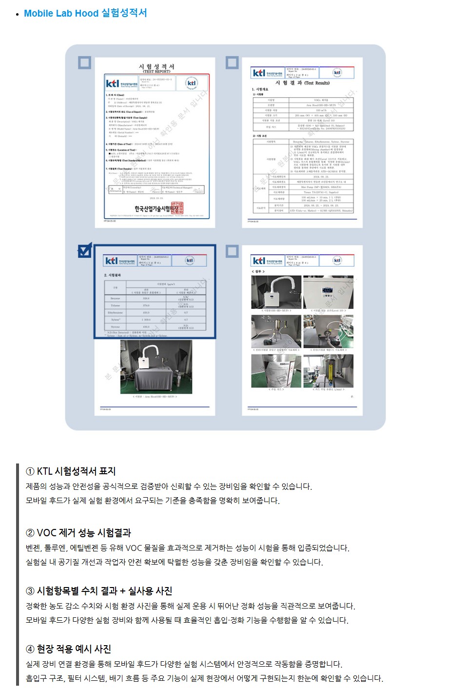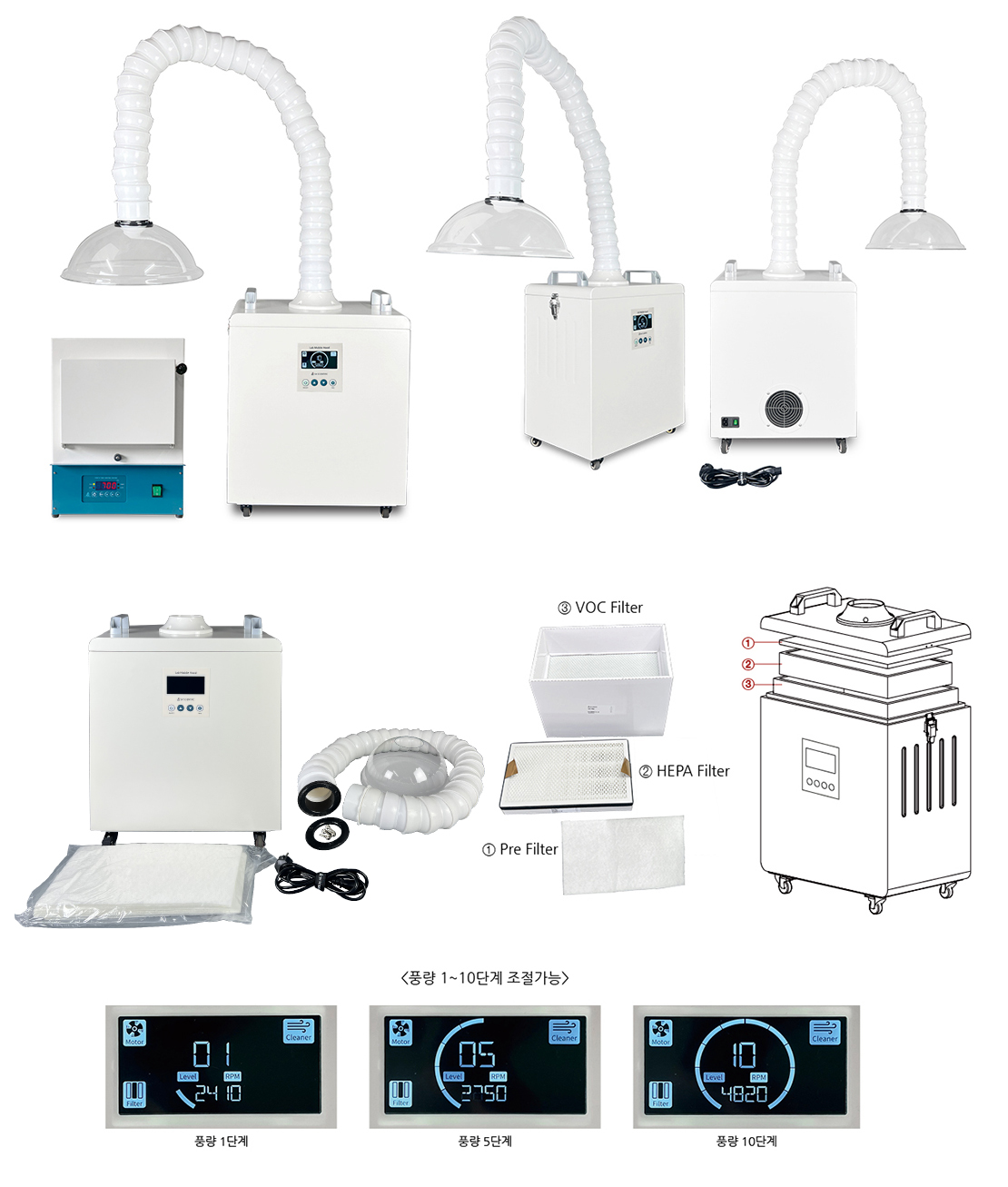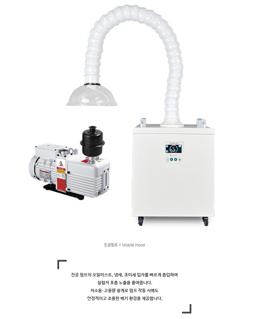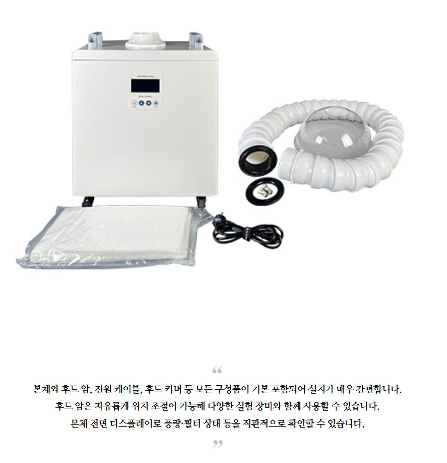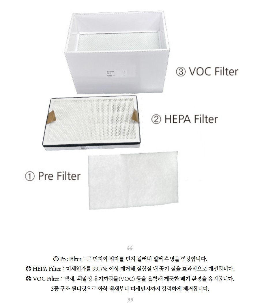 전기공사 없이 바로 설치·사용할 수 있으며, Pre·HEPA·VOC 3중 필터 구조로 실험실 대기 오염을 방지합니다.