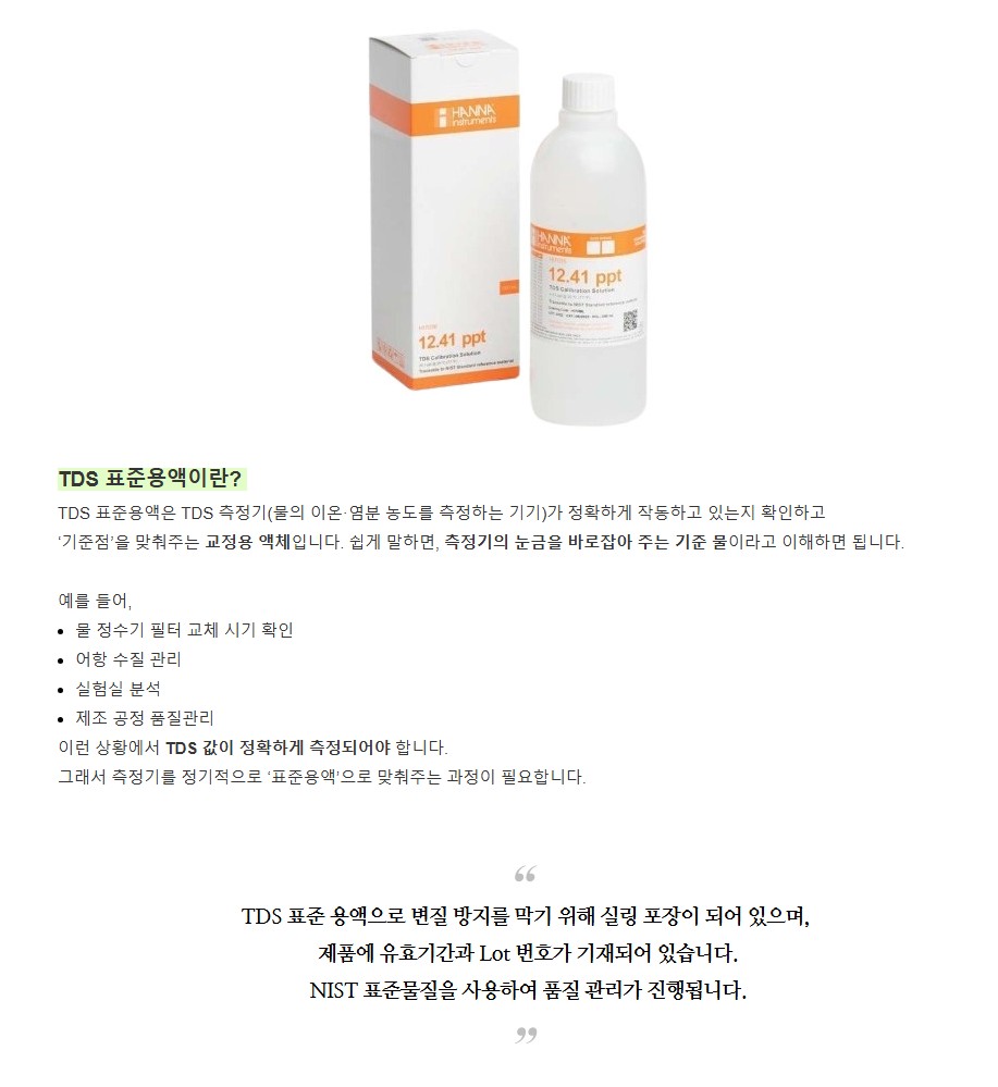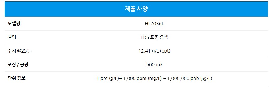 HI7036L(12.41ppt) TDS 표준용액은 TDS 측정기의 정확한 교정을 위해 제조된 실험·분석용 표준 용액입니다.