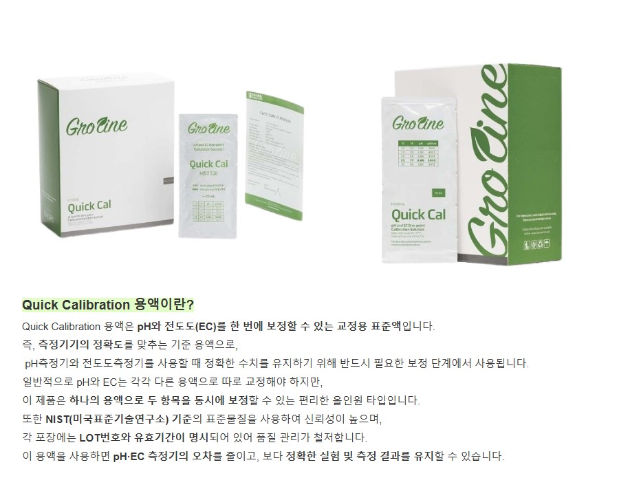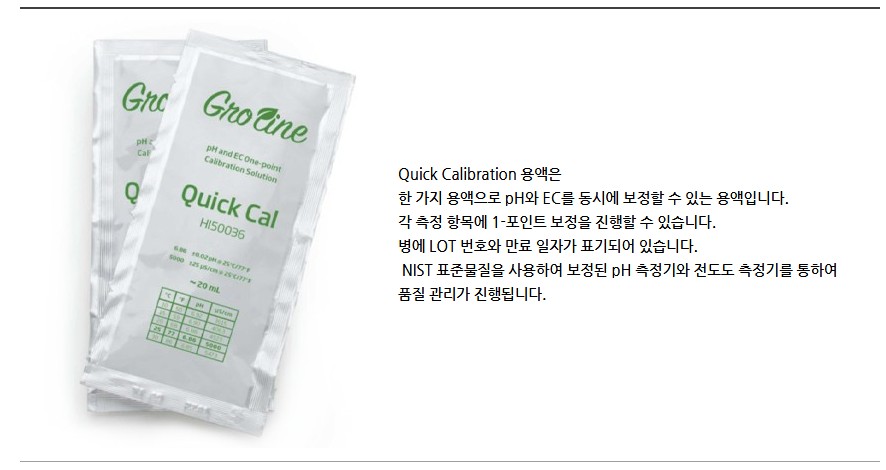 Quick Calibration 용액은 한 가지 용액으로 pH와 EC를 동시에 보정할 수 있는 용액입니다.