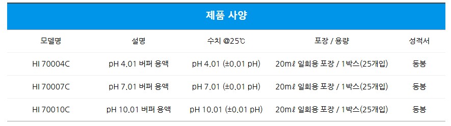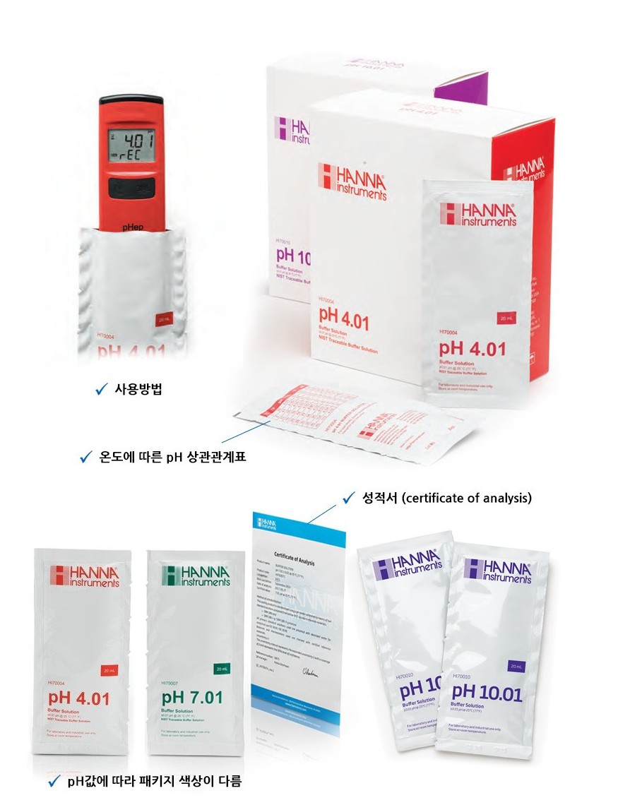 각 제품은 pH 4.01 / 7.01 / 10.01 세 가지 범위로 구성되어 있으며,