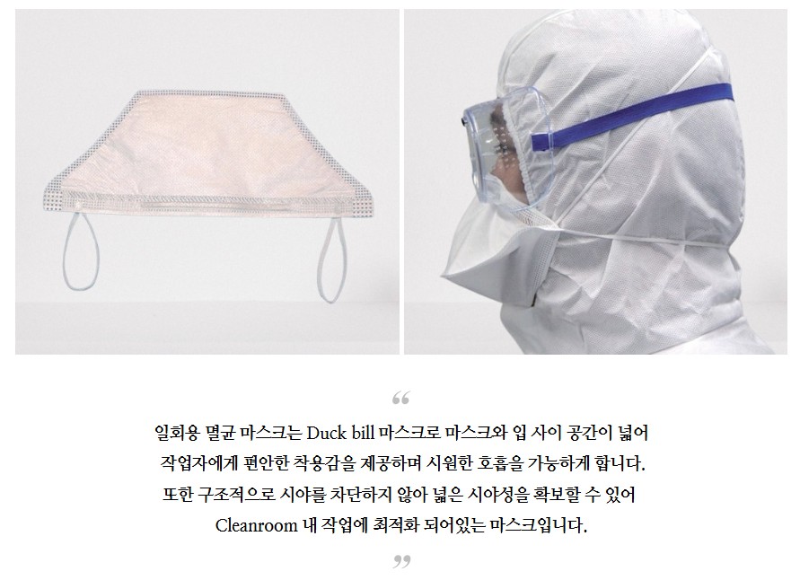 일회용 멸균 마스크는 Duck bill(덕빌) 구조로 제작되어 입과 코 사이의 공간이 넓어 착용감이 편안하고 호흡이 용이합니다.