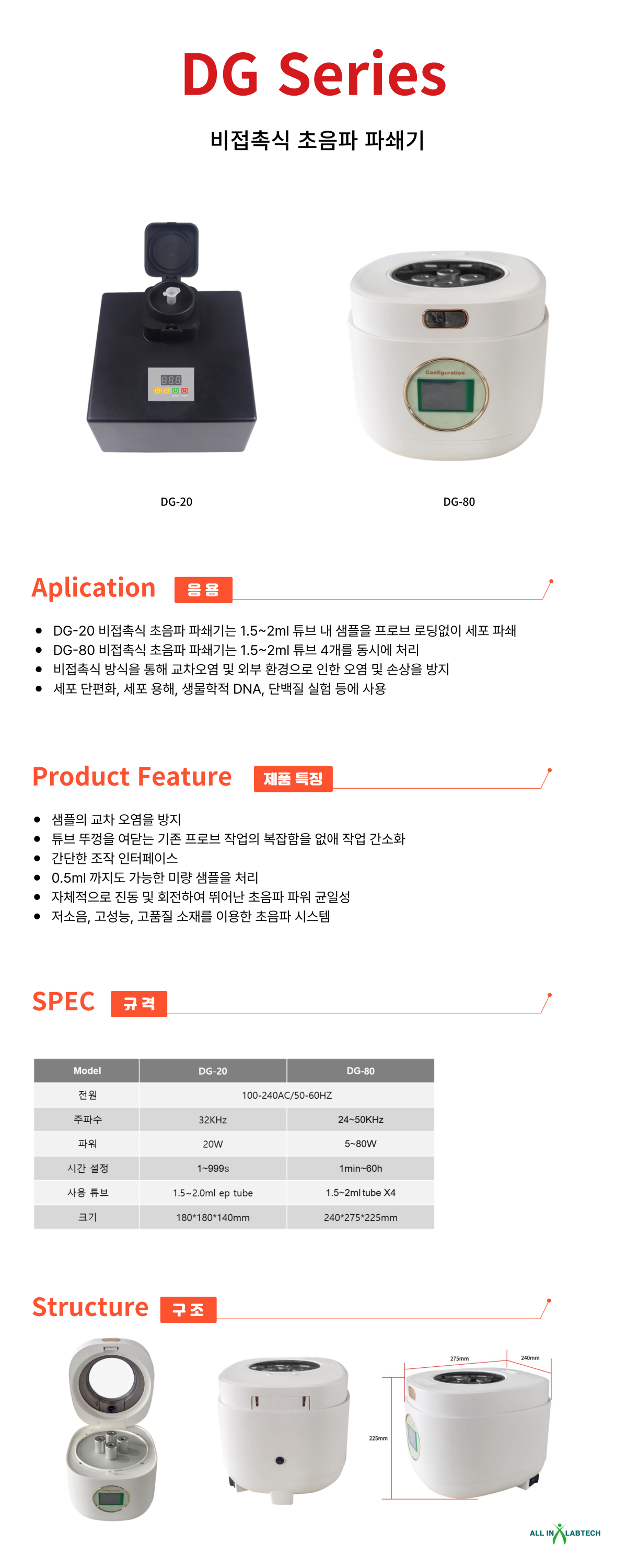 DG-20 비접촉식 초음파 파쇄기는 1.5ml~2ml 튜브 내 샘플을 프로브 로딩없이 세포 파쇄