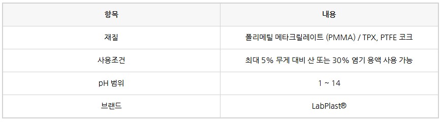 강산·강염기 희석액(5% 산 또는 30% 염기) 조건까지 안전하게 사용할 수 있어 실험실 정량 분주 작업에 적합합니다.