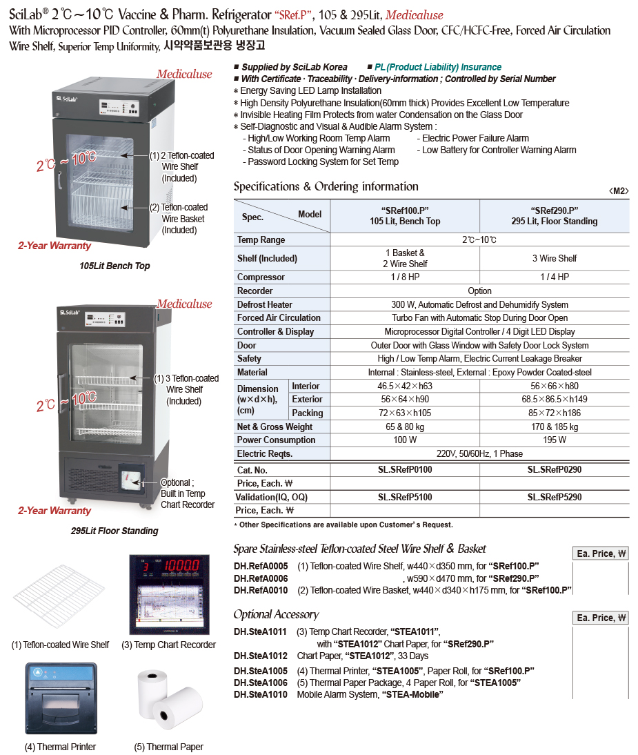SciLab® 2℃~10℃ Vaccine & Pharm. Refrigerator “SRef.P”, 105 & 295Lit, Medicaluse With Microprocessor PID Controller, 60mm(t) Polyurethane Insulation, Vacuum Sealed Glass Door, CFC/HCFC-Free, Forced Air Circulation Wire Shelf, Superior Temp Uniformity, 시약약품보관용 냉장고