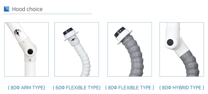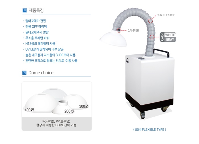 이동식 국소배기장치 : 실험실, 병원, 학교, 납땜 현장 등에서 발생하는 오염원을 설치장소의 제한없이 효과적으로 정화하여 배출