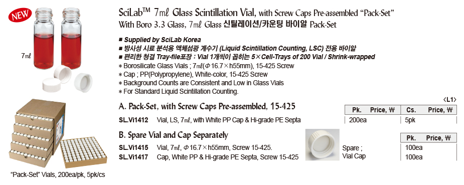 SciLab™ 7㎖ Glass Scintillation Vial, with Screw Caps Pre-assembled “Pack-Set” With Boro 3.3 Glass, 7㎖ Glass 신틸레이션/카운팅 바이알 Pack-Set
