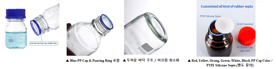 ■ 내열 플라스틱 캡 (+140℃) / 병 입구 Pouring Ring 부착 액체 흘림 방지 ■ 두꺼운 바닥 구조와 미끄럼 최소화 ■ 다양한 PP Cap Color와 PTFE Silicone Septa(별도 문의)
